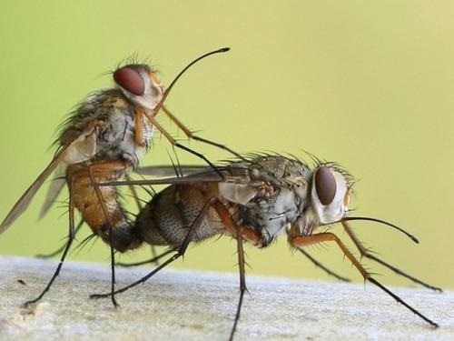 在適宜溫度下,雄性家蠅羽化后 18~24 小時(shí)、雌性家蠅羽化后 30 小時(shí)即可性成熟而交配。交配時(shí)間一般在清晨的 5:00~7:00。靈敏的嗅覺、性外激素和視覺,均是促進(jìn)雌雄蠅交配的重要因素。一對(duì)正在交配的家蠅,可以久駐一處,一同爬行,雙飛翔,有效交配時(shí)間長(zhǎng)達(dá) 1 小時(shí)。絕大多數(shù)家蠅終生只交配一次。雄蠅的精液可以長(zhǎng)久貯存于雌蠅的受精囊中,刺激產(chǎn)卵,并持續(xù) 2~3 周使蠅卵不斷受精,而不必與另一只雄蠅交配。這在其他昆蟲中是罕見的。這正是蒼蠅繁殖力旺盛的重要原因。